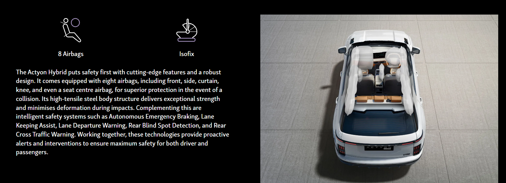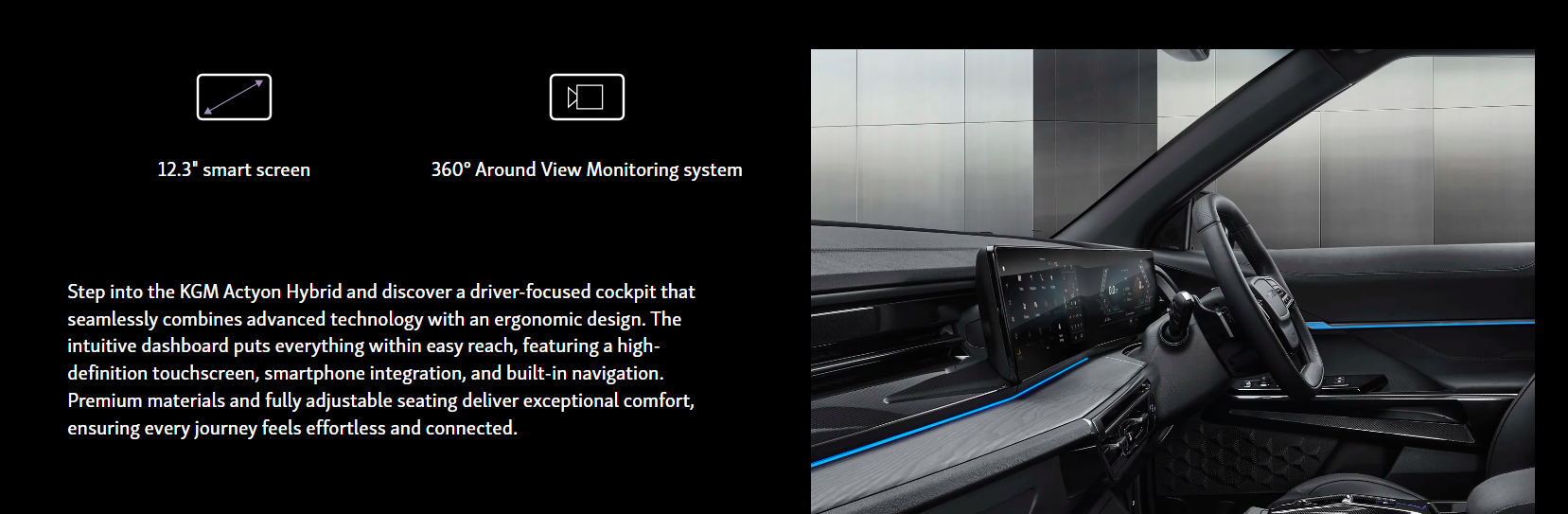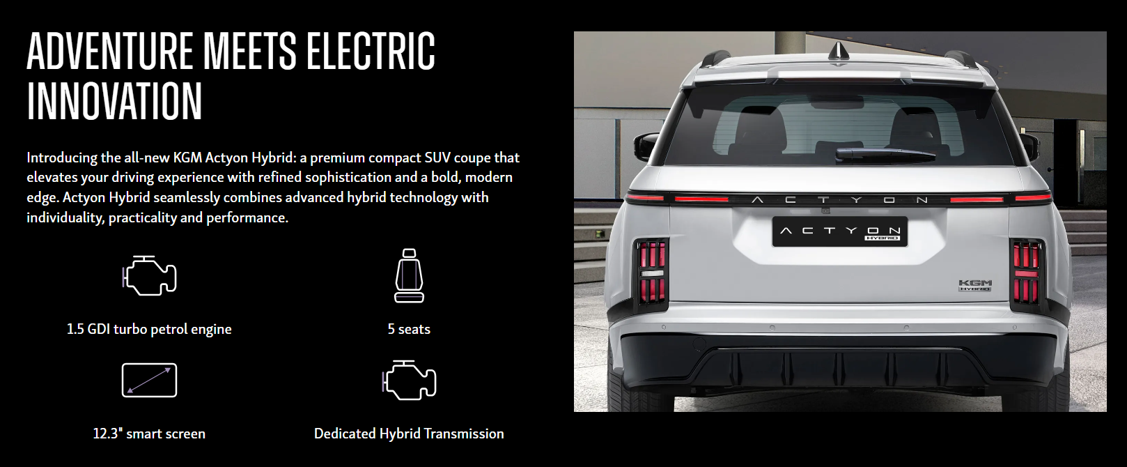 The KGM Actyon Hybrid is a compact SUV featuring a new Dual-Tech Hybrid system that pairs a 1.5L turbocharged petrol engine with electric motors for improved efficiency and an EV-like feel, offering smooth power, up to 46.4 mpg, and advanced safety features like AEB and lane assist, blending practicality with modern design
